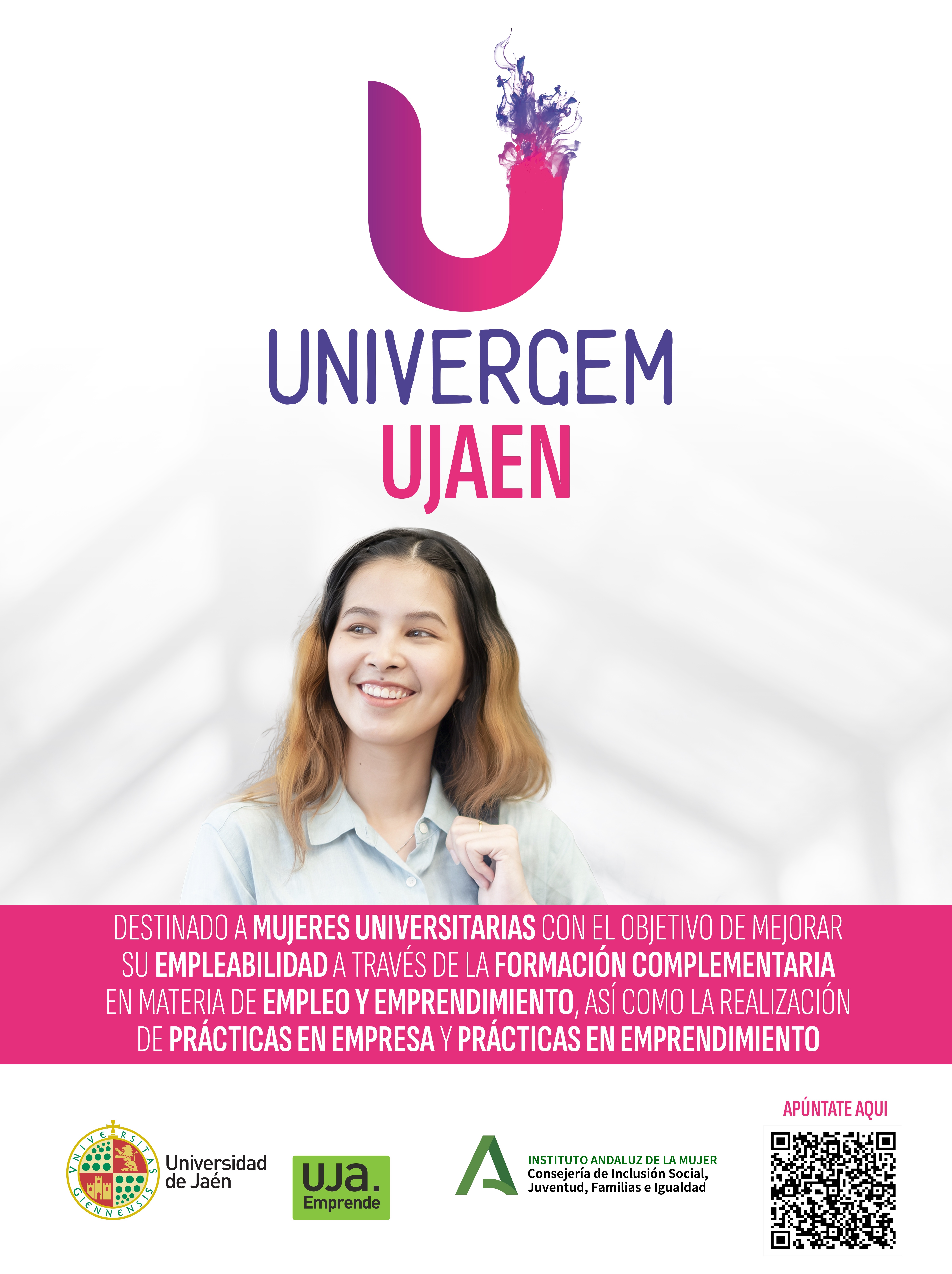 UNIVERGEM UJAEN 2025 est谩 subvencionado por el Instituto Andaluz de la Mujer y cuenta con el apoyo de la Universidad de Ja茅n para brindar, de forma gratuita, formaci贸n a todo su alumnado, matriculado y titulado, desde la perspectiva de g茅nero y pr谩cticas a mujeres universitarias, con el fin de promover su incorporaci贸n al mercado de trabajo.