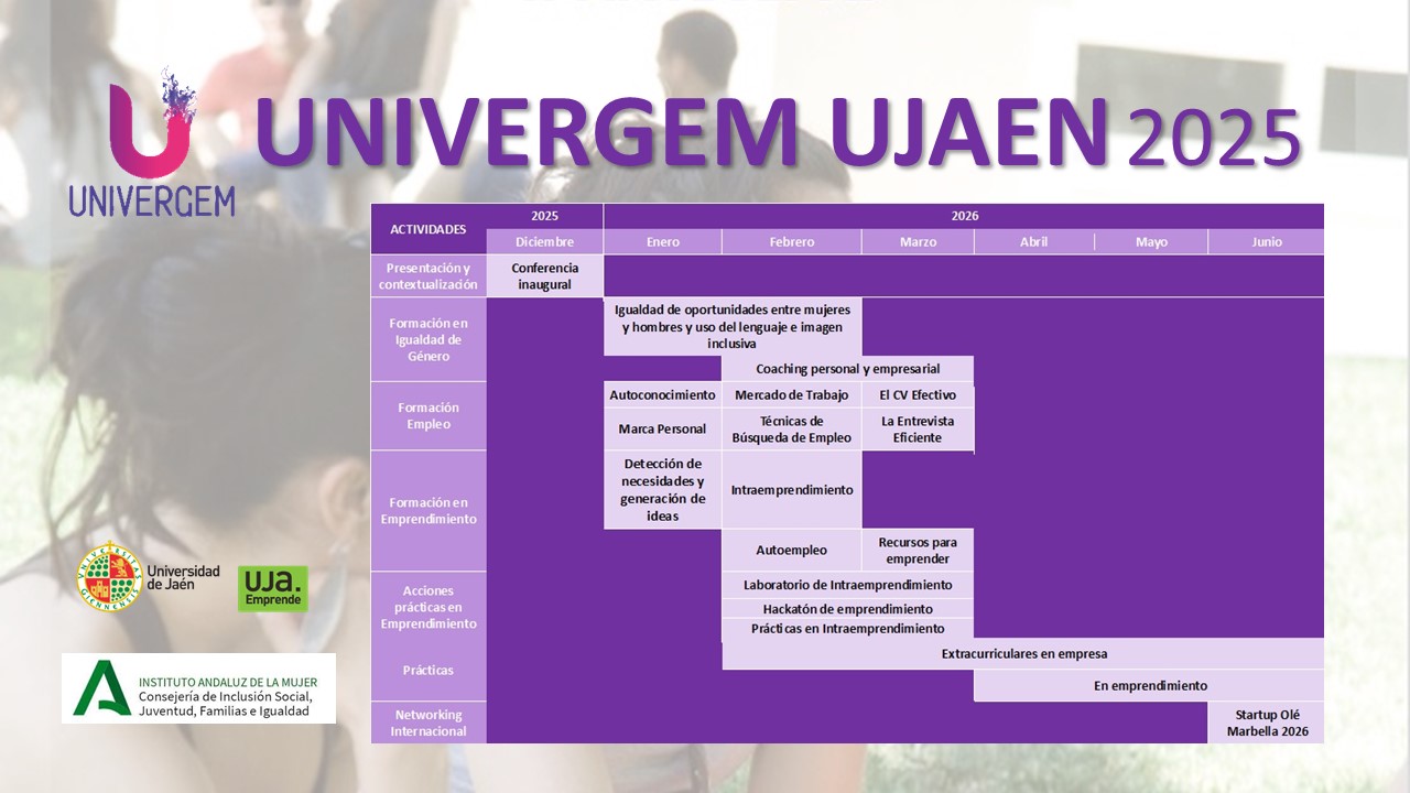 En esta edici贸n, UNIVERGEM ofrece formaci贸n en materia de empleo, emprendimiento e igualdad de oportunidades a todo el alumnado matriculado y egresado de la Universidad de Ja茅n. Adem谩s, las mujeres universitarias podr谩n completar esta formaci贸n con pr谩cticas extracurriculares en empresas colaboradoras y/o con pr谩cticas en emprendimiento en los Viveros de Empresas de la UJA.