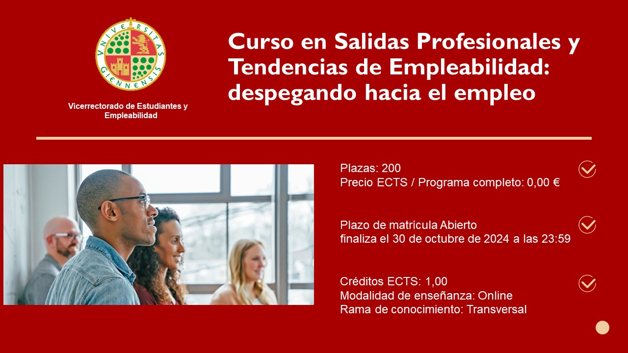 El Vicerrectorado de Estudiantes y Empleabilidad de la Universidad de Ja茅n, organiza para el curso 2024-2025 un programa de actividades de formaci贸n en colaboraci贸n con Trespasos Consultores, haciendo posible que la Universidad de Ja茅n participe en el fomento de la empleabilidad de la comunidad universitaria, con especial atenci贸n a sus estudiantes.