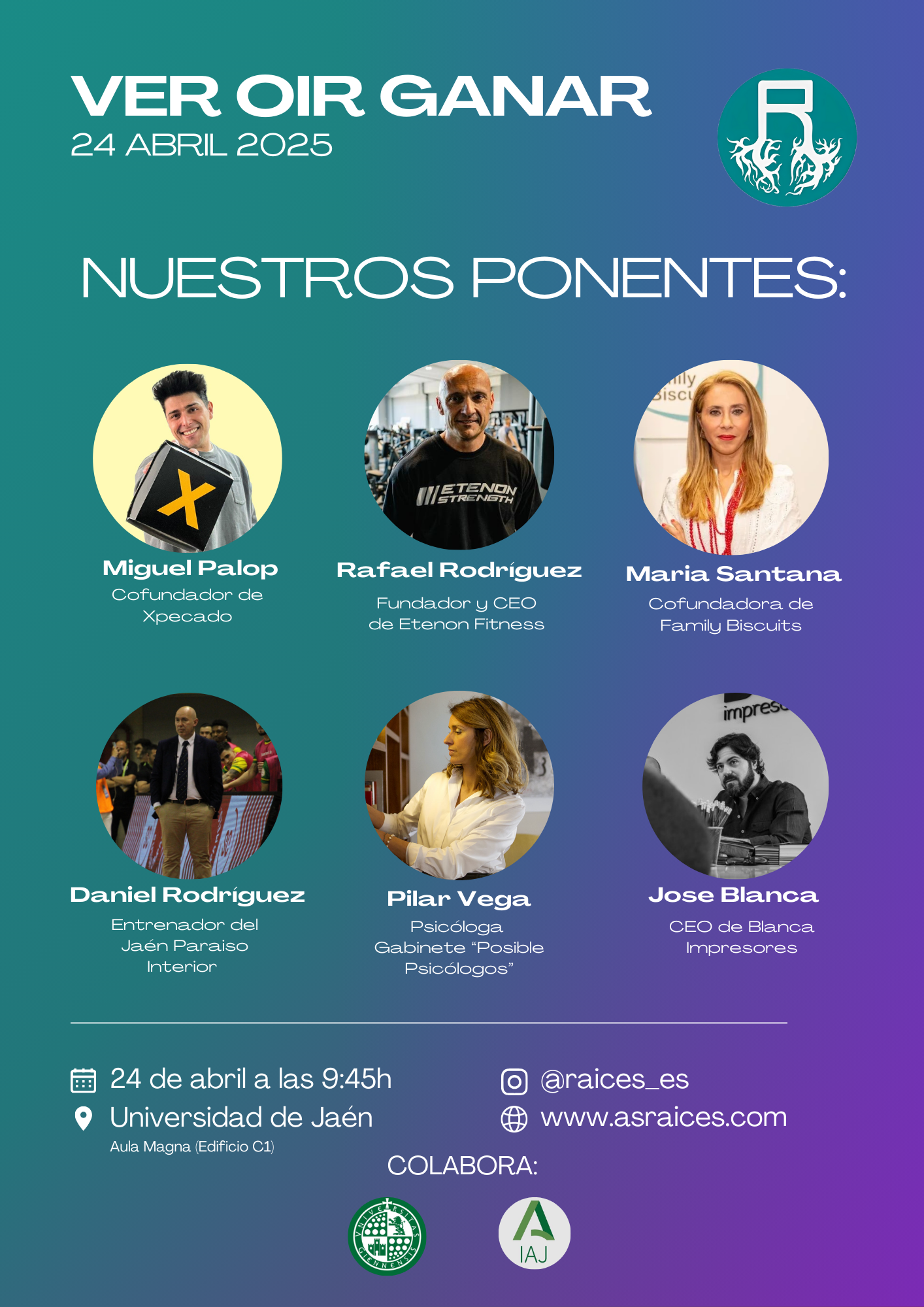 El Vicerrectorado de Estudiantes y Empleabilidad colabora con la asociación RAÍCES que organiza el Congreso realizado por y para jóvenes, titulado "VER, OÍR Y GANAR" II, que se realizará el próximo jueves 24 de abril en el Aula Magna de la Universidad de Jaén, a partir de las 09:45 h.